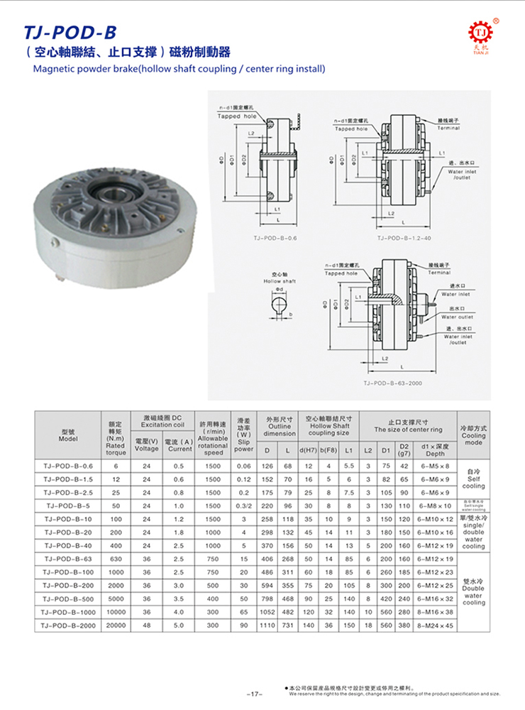 該型TJ-POD-B為內(nèi)殼旋轉(zhuǎn)、空心軸磁粉制動器(剎車器),采用進(jìn)口軸承、磁粉及100%使用漆包線圈等,可大大提高制動器壽命、線性度、性能。廣泛應(yīng)用于造紙、印刷、 塑料、橡膠、紡織、印染、電線電纜、冶金以及其他有關(guān)卷取加工行業(yè)中的放卷和收卷張力控制。其特點(diǎn)如下: