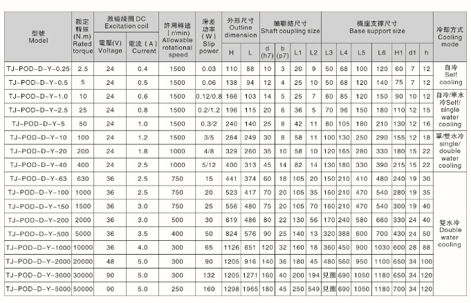 單軸機座式磁粉制動器(TJ-POD-D-Y)的安裝尺寸及型號參數如下: