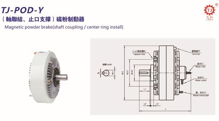 天機牌水冷式磁粉制動器(TJ-POD-Y)的安裝尺寸和具體參數(shù)如下: