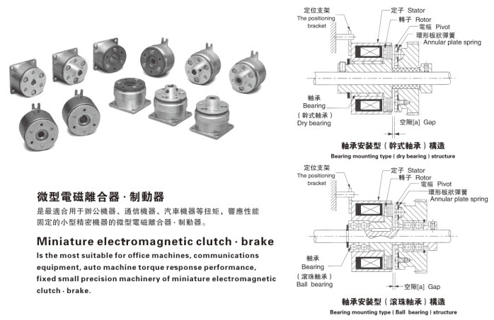 微型電磁離合器與微型電磁制動器設計基本雷同,內置線圈的定子填入填充材料的轉子與填充材料相摩擦的電樞單元,并且通過正確的定位、組合,形成磁路,定子是可以簡單地組合到軸上的軸承安裝型,根據軸的旋轉速度可選干式軸承安裝型及滾珠軸承安裝型。也可通過電樞上組合齒輪、滑輪,或者分別與軸進行組合,可以定制多種產品。