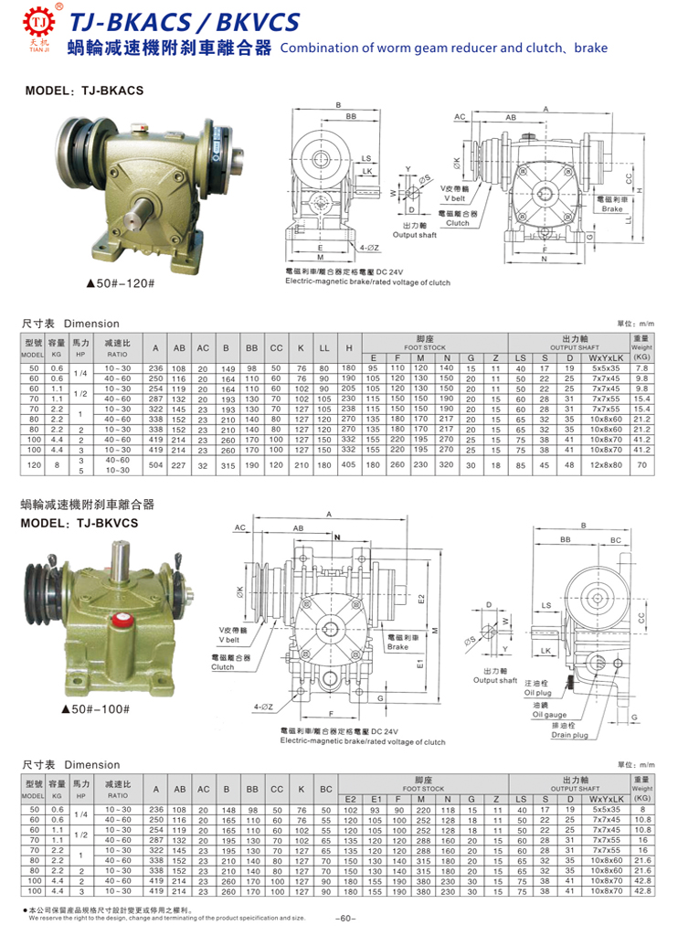 TJ-BKACS電磁剎車離合減速機尺寸規格如下:
